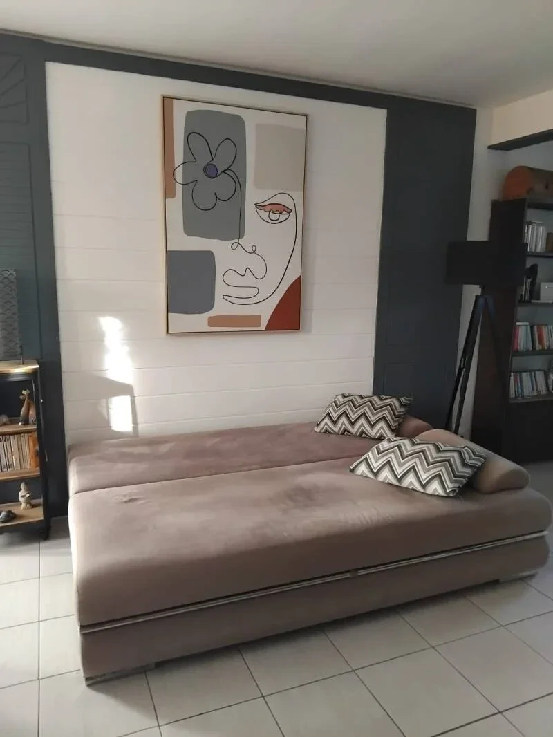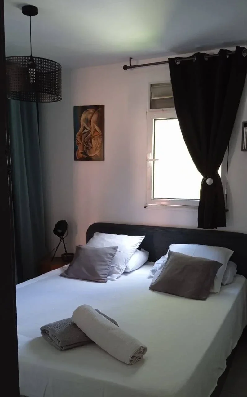 une grande chambre climatisée avec un lit de 160 et un canapé convertible dans le salon avec une literie confortable.